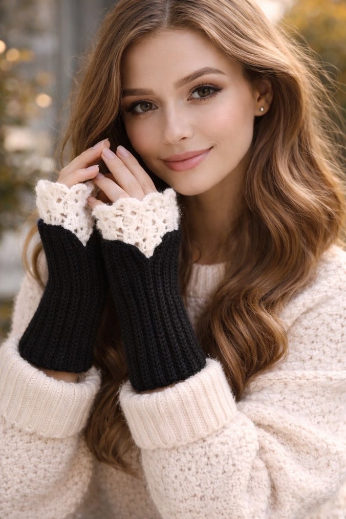 Bu örgü eldivenler, siyah taban ve beyaz dantel detaylarıyla gotik ve şık bir görünüm sunar. Rahat ve trend bir stil için idealdir.