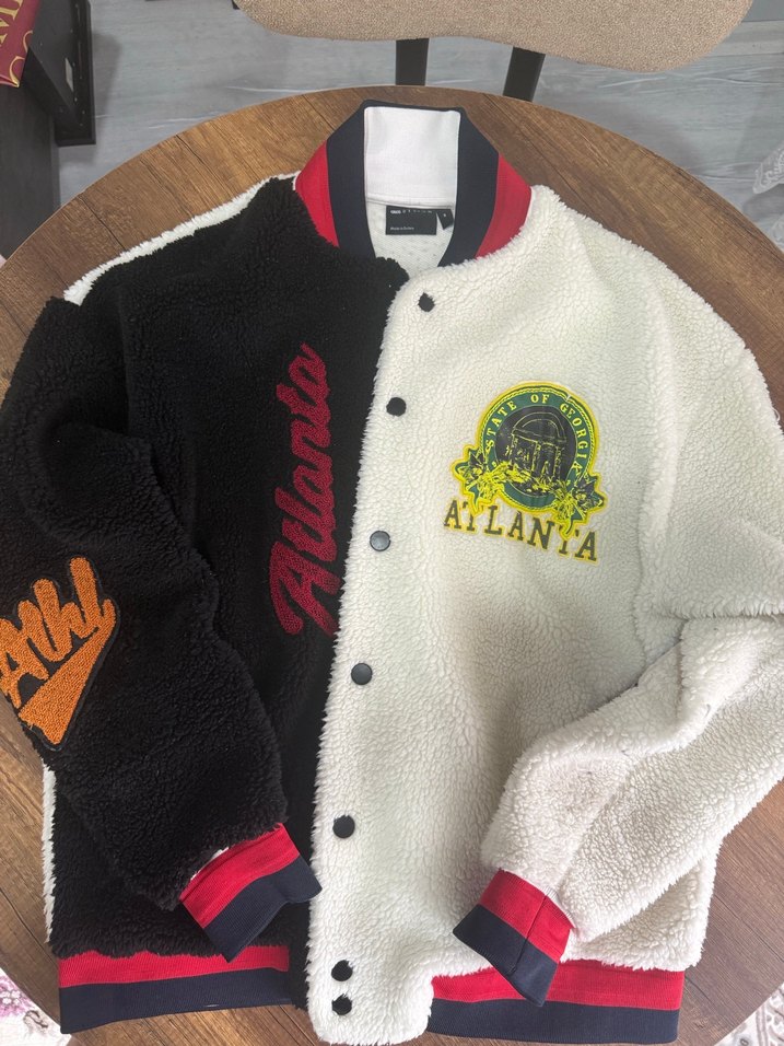 Kadınlar için uzun kollu, yuvarlak yaka, rahat kesim spor ceket. Peluş dokulu, kürk detaylı, beyaz-siyah renkli, baskılı Atlanta temalı.
