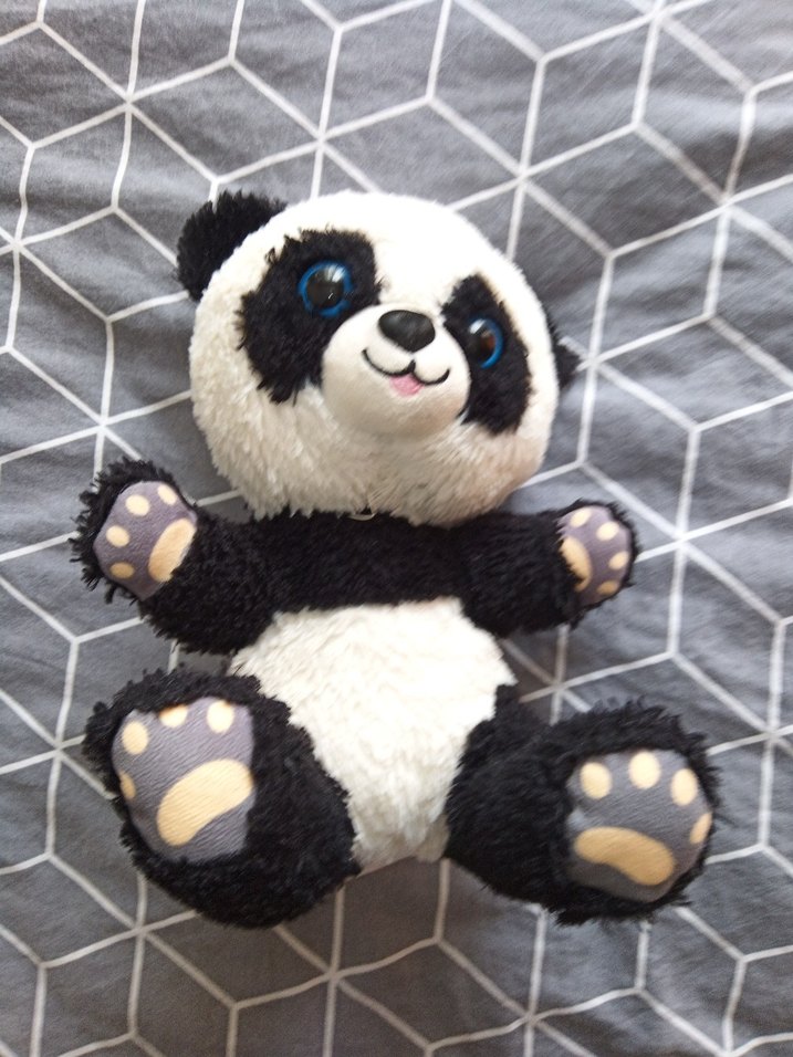 Beyaz ve siyah renklerde, büyük mavi gözlü yumuşak peluş panda oyuncak.