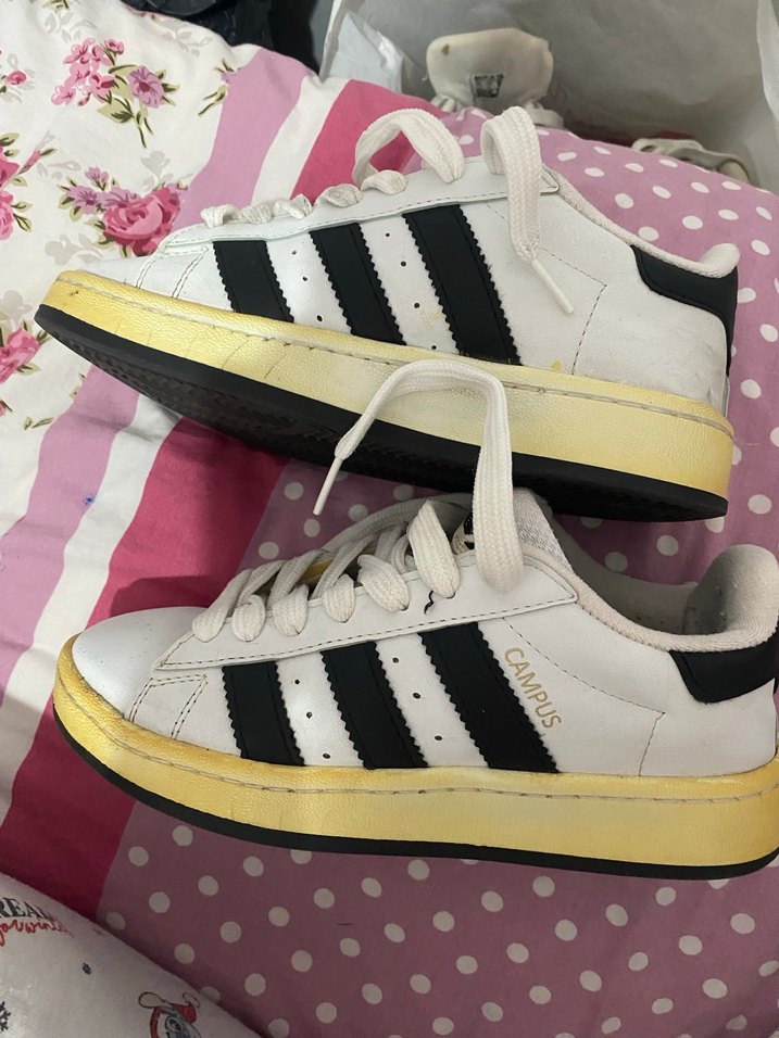 Beyaz renkli, siyah şeritli platform topuklu spor ayakkabılar. Bağcıklı ve kauçuk tabanlı, sokak modası ve spor tarzını birleştirir.