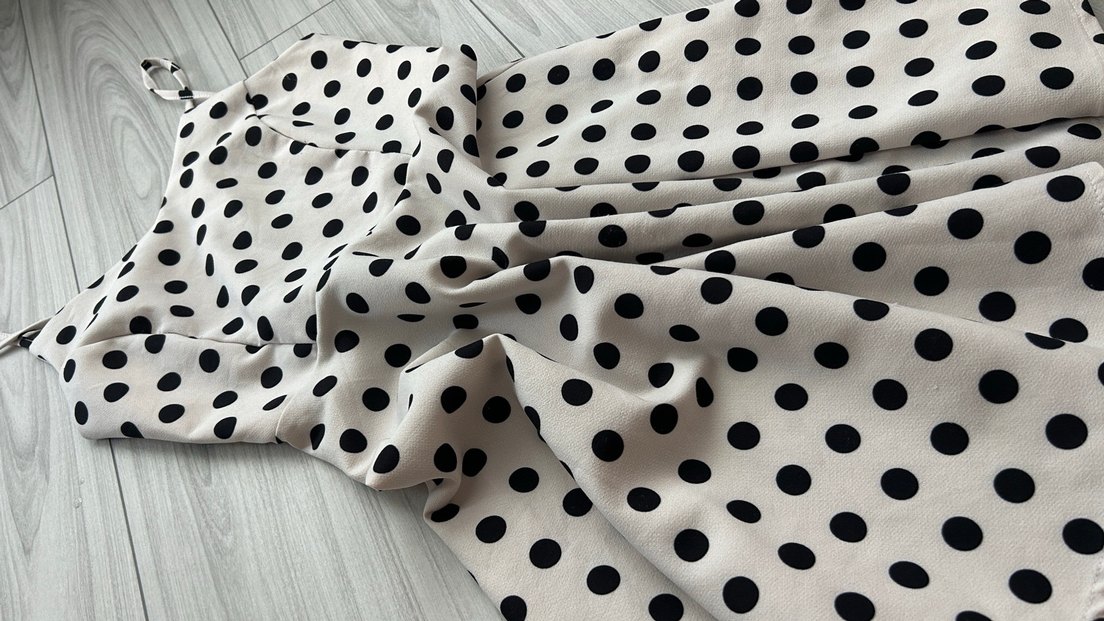 Kadınlar için beyaz zemin üzerine siyah puantiyeli, dökümlü tasarıma sahip sentetik kumaştan elbise. Paris tarzı, çağdaş bir görünüm sunar.