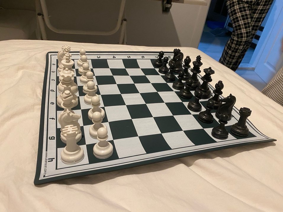 Beyaz ve siyah taşlarla hazırlanmış satranç takımı, kenarlarında numaralandırma bulunan kareli oyun tahtası ile birlikte.1977 star satranç takımı