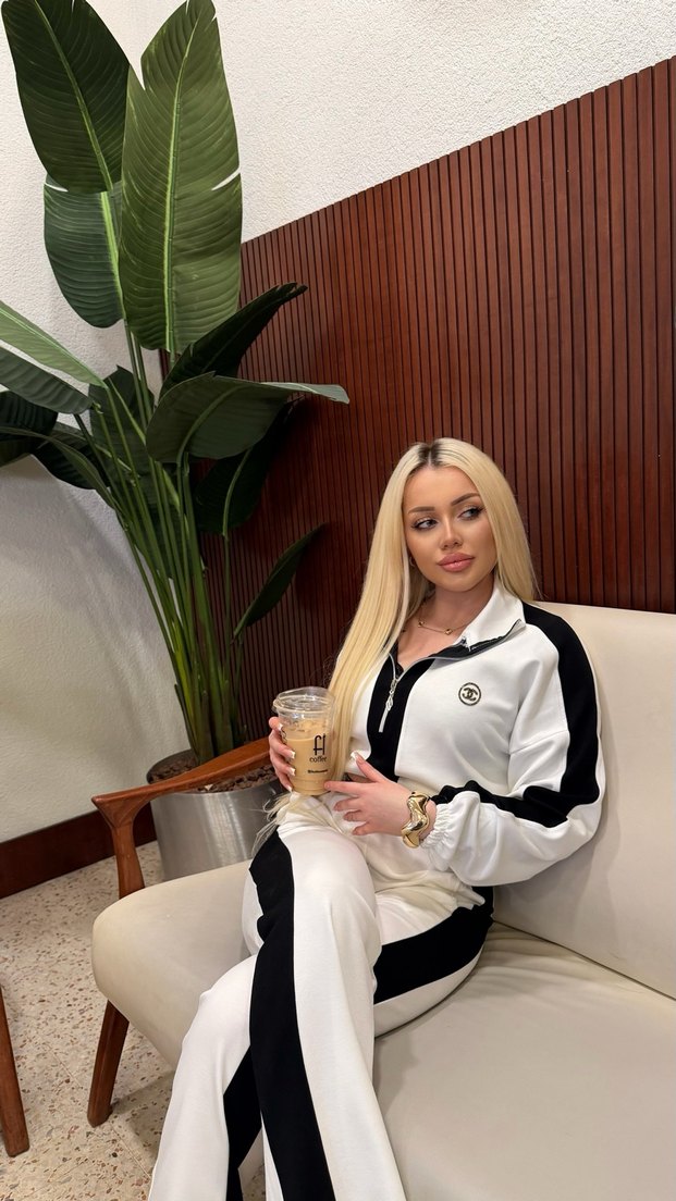 Yüksek yakalı, uzun ve kabarık kollu beyaz eşofman takımı, siyah şerit detaylı. Sentetik kumaştan, rahat kesim ve baskılı desenli, trend günlük stil için uygun. ♀️