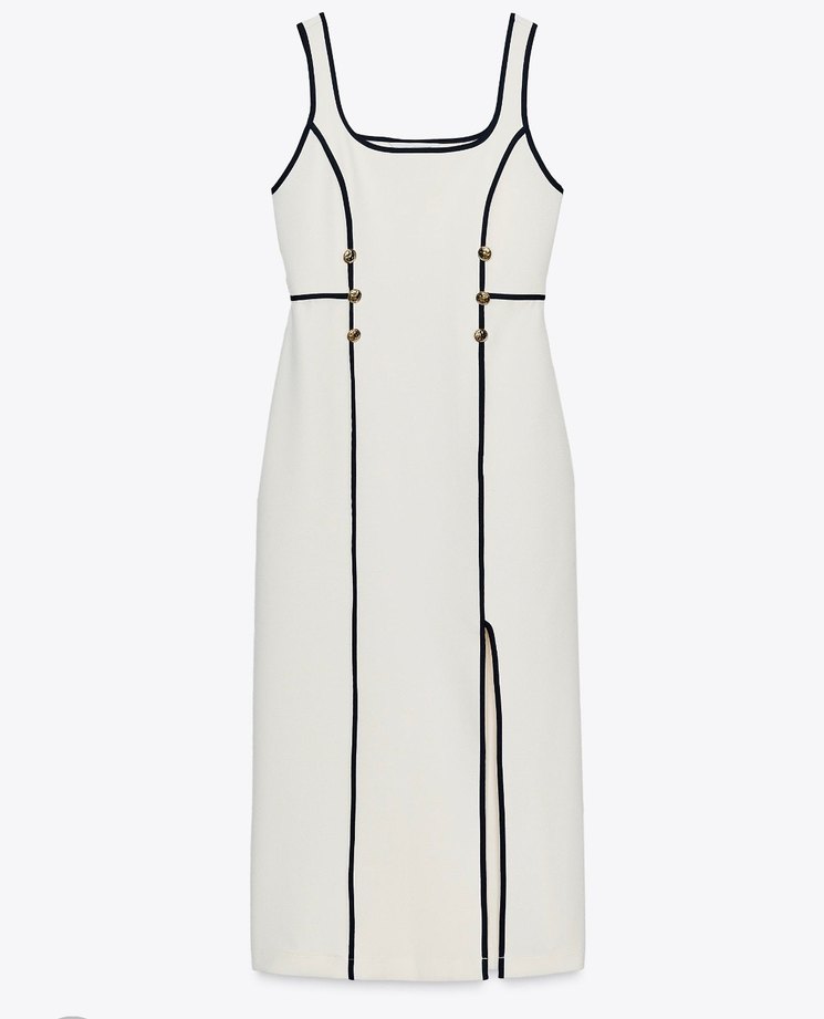 Beyaz uzun elbise, askılı kollar ve kemerli bel ile siyah şerit detaylara sahip. Teknolojik dokunuşlu, Paris esintili modern tasarım.
