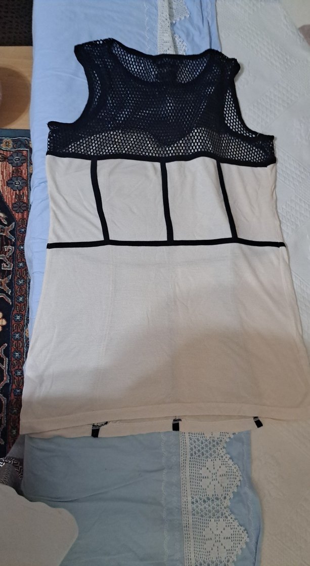 Normal boyda, beyaz taban üzerine siyah file detaylı, siyah dikey çizgilerle desteklenen slim kesim