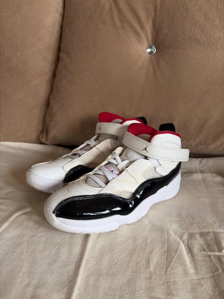 Beyaz ve siyah parlak detaylı, tokalı basketbol ayakkabısı. Sokak stili ve spor için uygun, şıklık ve rahatlığı bir arada sunar.