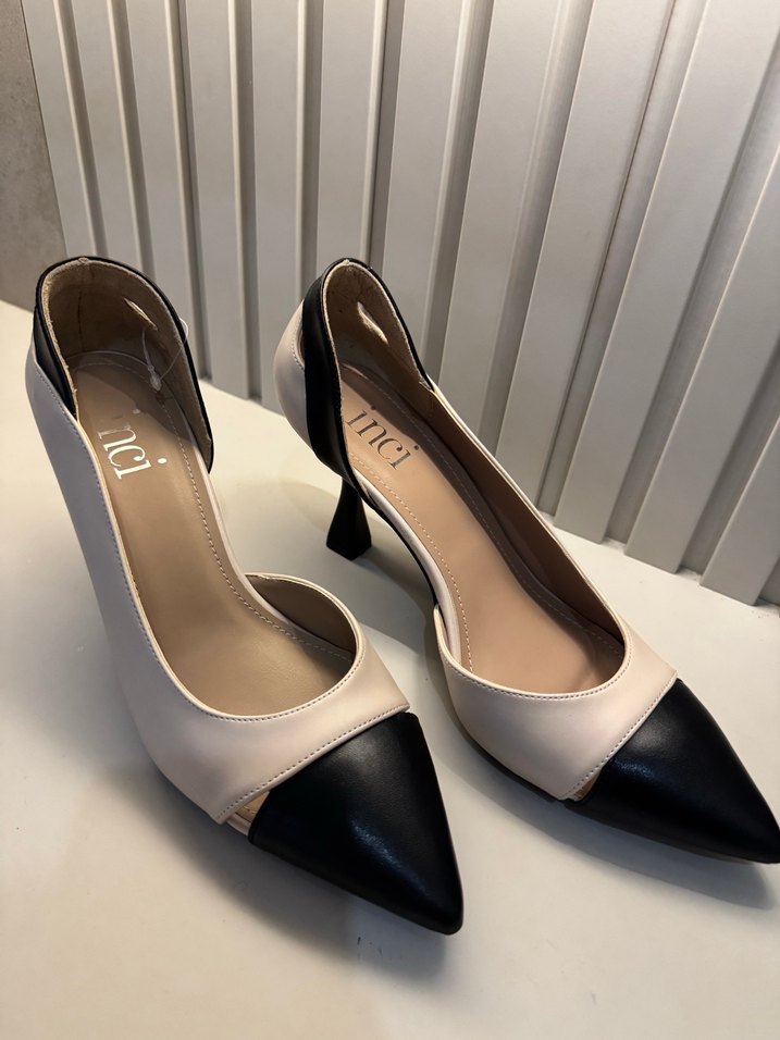 Beyaz ve siyah renklerde, plise detaylı, ofis kullanımı için uygun kauçuk malzemeden yapılmış stiletto topuklu ayakkabılar. Modern klasik ve Paris tarzı. Aşırı şık bir topuklu geri iade yoktur 38 numara