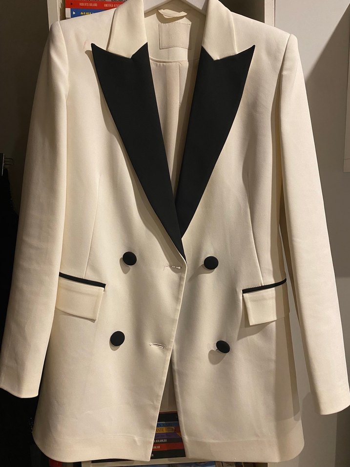 Notched yaka, düğmeli, siyah detaylı beyaz kadın blazer. Ofis için modern klasik tarzda, normal boy ve regular fit, ipeksi dokulu. Ya da Gece elbiselerinin üzerine atın ve en şık siz olun.