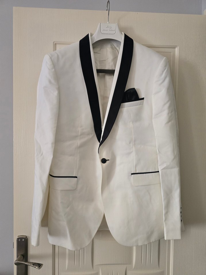Beyaz renkte, siyah yakalı ve düğmeli erkek ceketi Normal kesim ve modern klasik tarzda kullanımı için uygundur. ️kovboy 65 cm. ceketi uzunluk 77 cm dir. ceketi cepleri açılabilir.