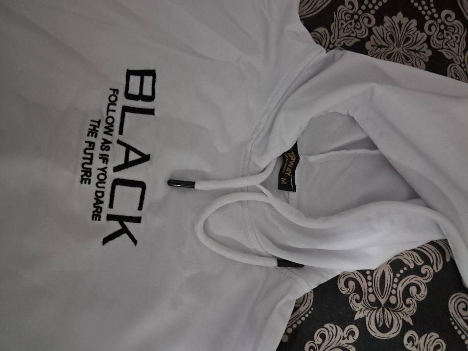 Önünde siyah "BLACK" yazısı ve uçları siyah olan beyaz bağcıkları bulunan beyaz erkek kapüşonlu sweatshirt. Minimalist sokak stili