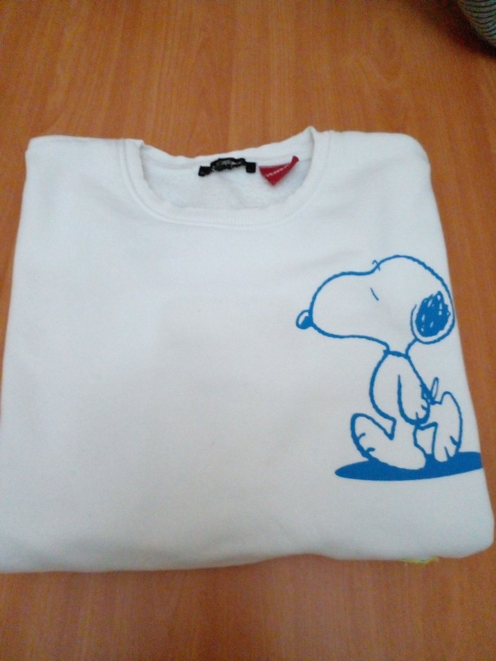 Beyaz pamuklu sweatshirt, renkli Snoopy baskılı, yuvarlak yakalı ve uzun kolludur. Salaş kesimi ve normal boyu ile gündelik rahat stil sunar.L bedene kadar giyilebilir.görselde görüldüğü yerde defo vardi arma dikildi