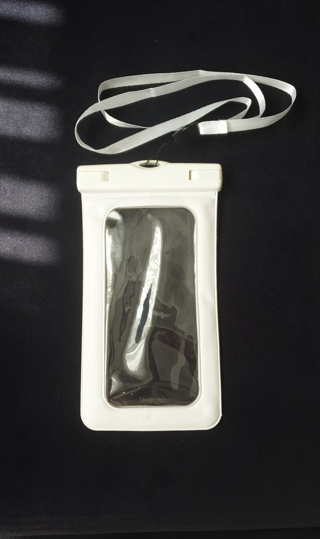 Şeffaf ön paneli olan beyaz su geçirmez telefon kılıfı, beyaz sokak stili ve kullanışlı askıyla tasarlanmıştır.