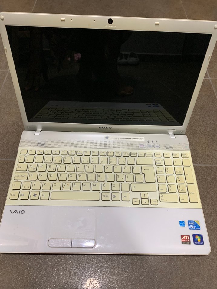 Tam klavyeli ve dahili web kameralı beyaz Sony VAIO laptop. Palm rest alanında Intel ve ATI logoları bulunur.