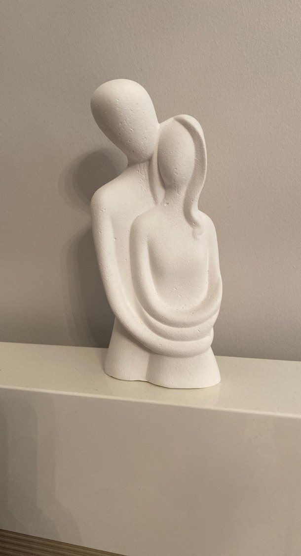 Beyaz, soyut bir çift figürünü gösteren, pürüzsüz ve açık renkli malzemeden yapılmış minimal dekoratif biblo. Malzeme -alçı