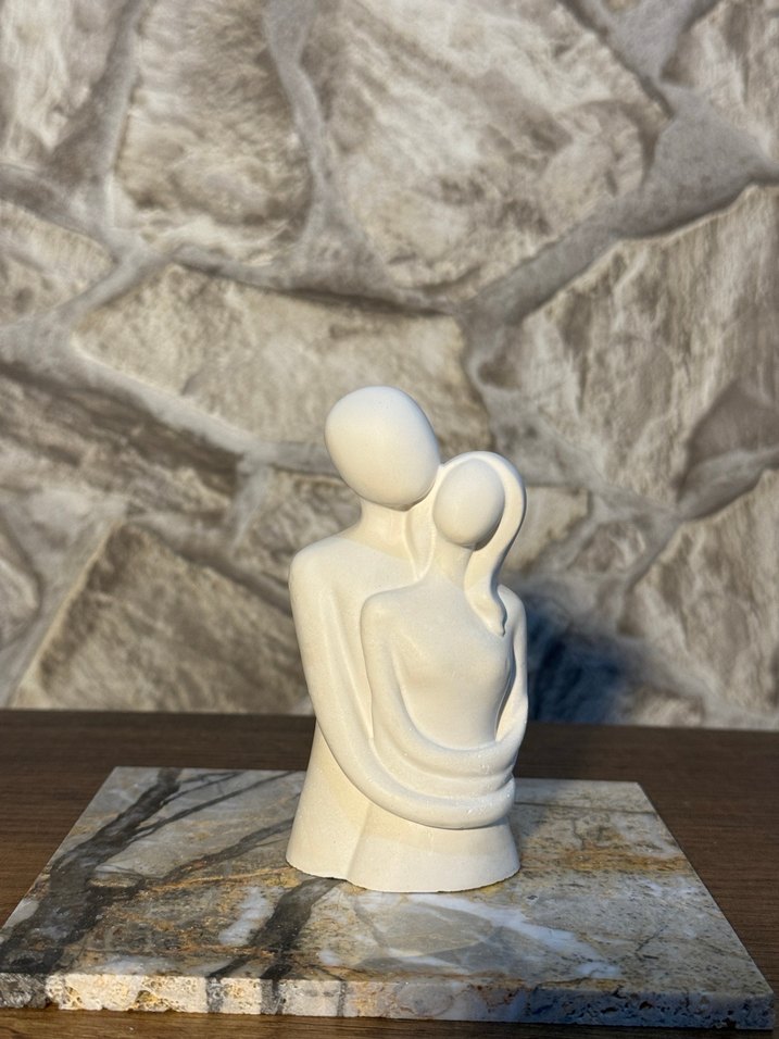 Beyaz soyut figürin, kucaklaşan çift şeklinde, pürüzsüz malzemeden yapılmış ve mermer kaide üzerinde duruyor. Sanatsal ve zarif bir dekoratif obje.