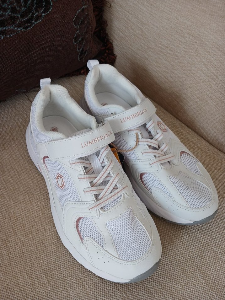 Beyaz spor ayakkabısı, bağcıklı ve cırt cırtlı, hafif kauçuk tabanlı. "LUMBERJACK" markalı, 36 numara. etiketi ile duruyor. Aldığım fiyat görsellerde ekli