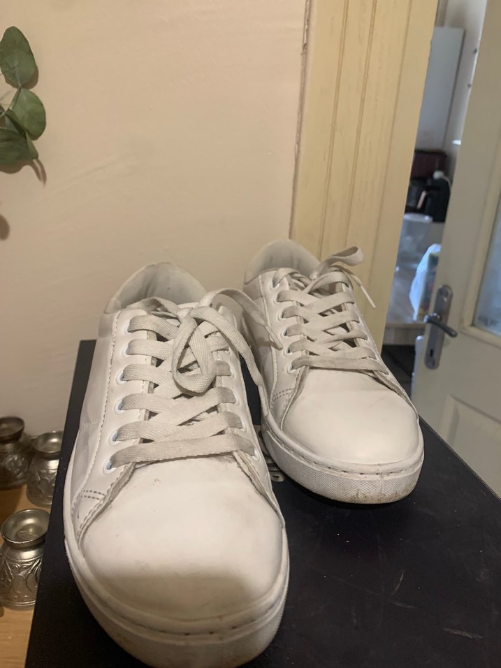 Düz tabanlı, beyaz kauçuk tabanlı kadın spor ayakkabısı. Günlük kullanım ve rahat şıklık için uygundur.