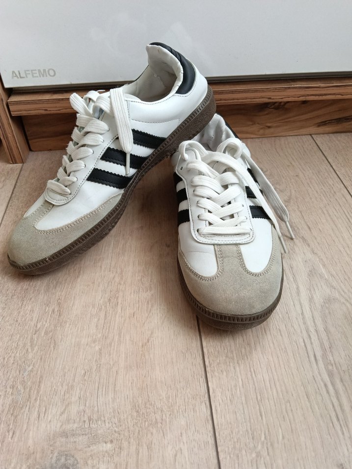 Siyah çizgili beyaz spor ayakkabı, kauçuk tabanlı ve rahat stil sunar. orjinal.degildir son.resimde ufak kusurlari var.belirttim