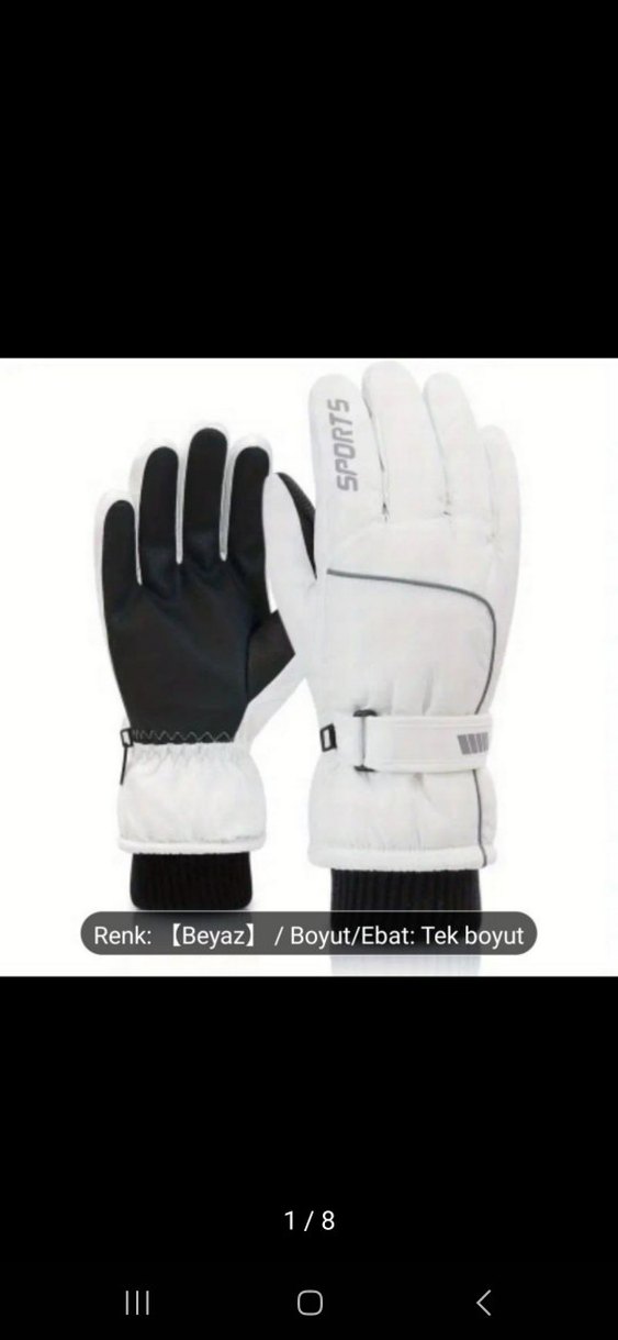 Beyaz dış yüzeyli, gri baskılı detaylara ve siyah avuç içine sahip erkek eldivenleri. Ayarlanabilir kayışlı, spor tarzda şık ve rahat kayak eldiveni