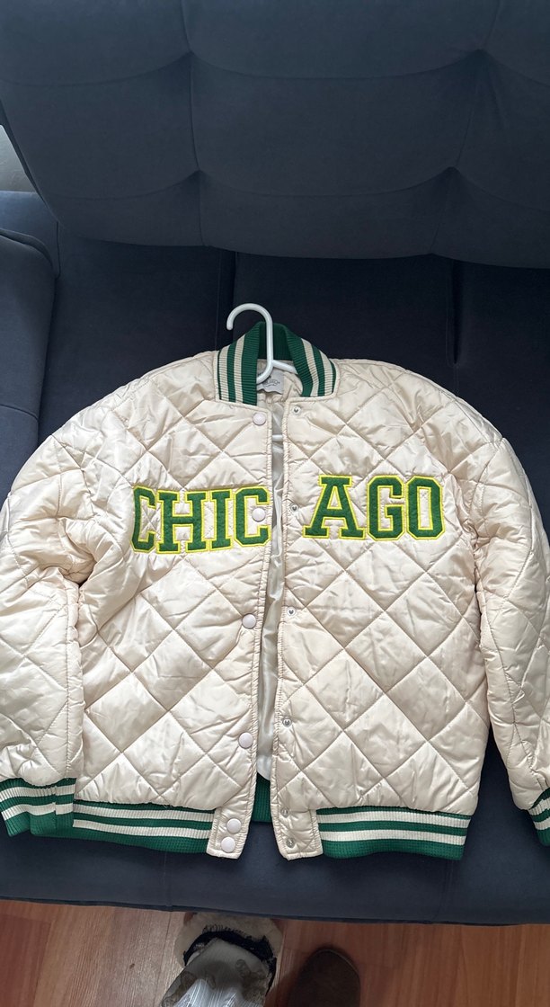 Düğmeli ve nakışlı "CHICAGO" yazılı, parlak beyaz kapitone kumaştan, uzun kollu, normal boy, dar kesim kadın ceket. Rahat ve şık görünüme uygun.