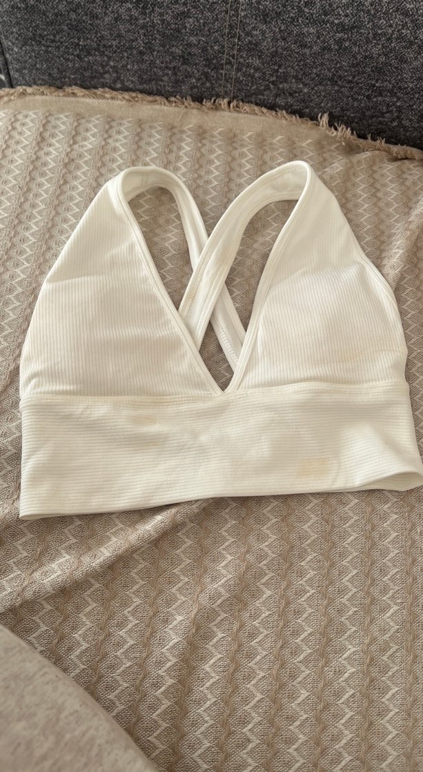 Bu beyaz spor sütyeni, sokak modasına uygun çapraz sırt askıları ve fitilli dokusu ile normal uzunluktadır.