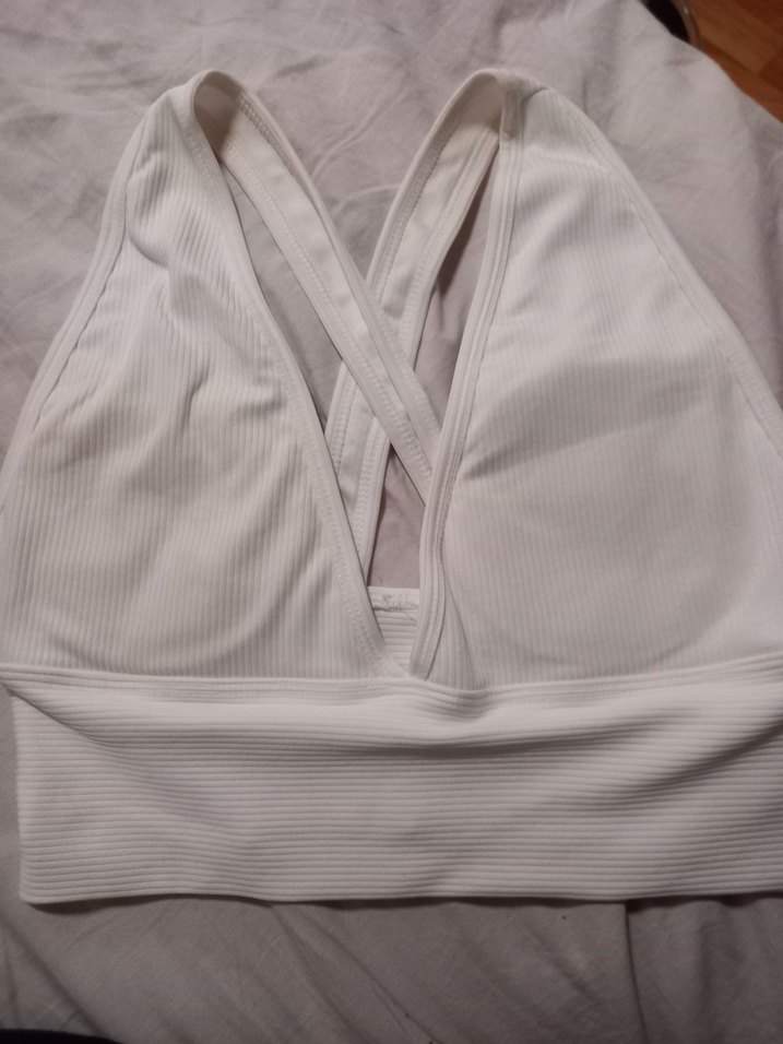 Beyaz renkli, çapraz askılı ve çizgili dokulu spor sütyeni. Rahat ve destekleyici yapısıyla günlük kullanıma uygun.