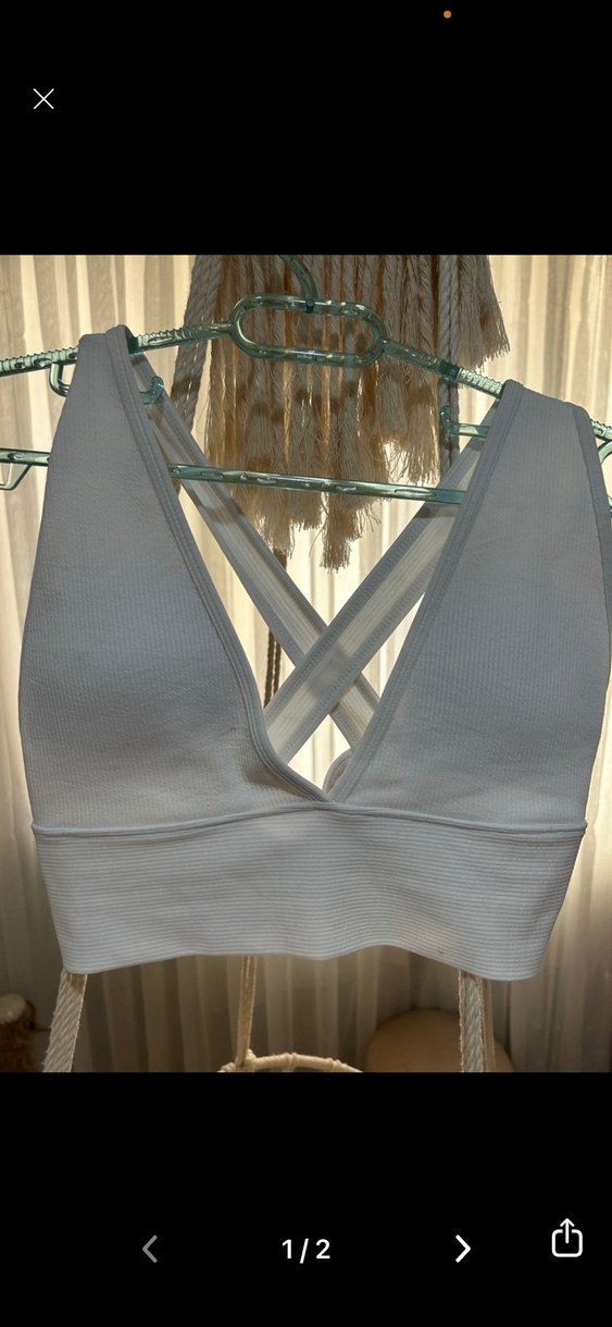 Beyaz renkli, çapraz askılı ve normal boyda, yumuşak ve nefes alabilen kumaştan yapılmış spor sütyeni. Sokak modasına uygun. ️