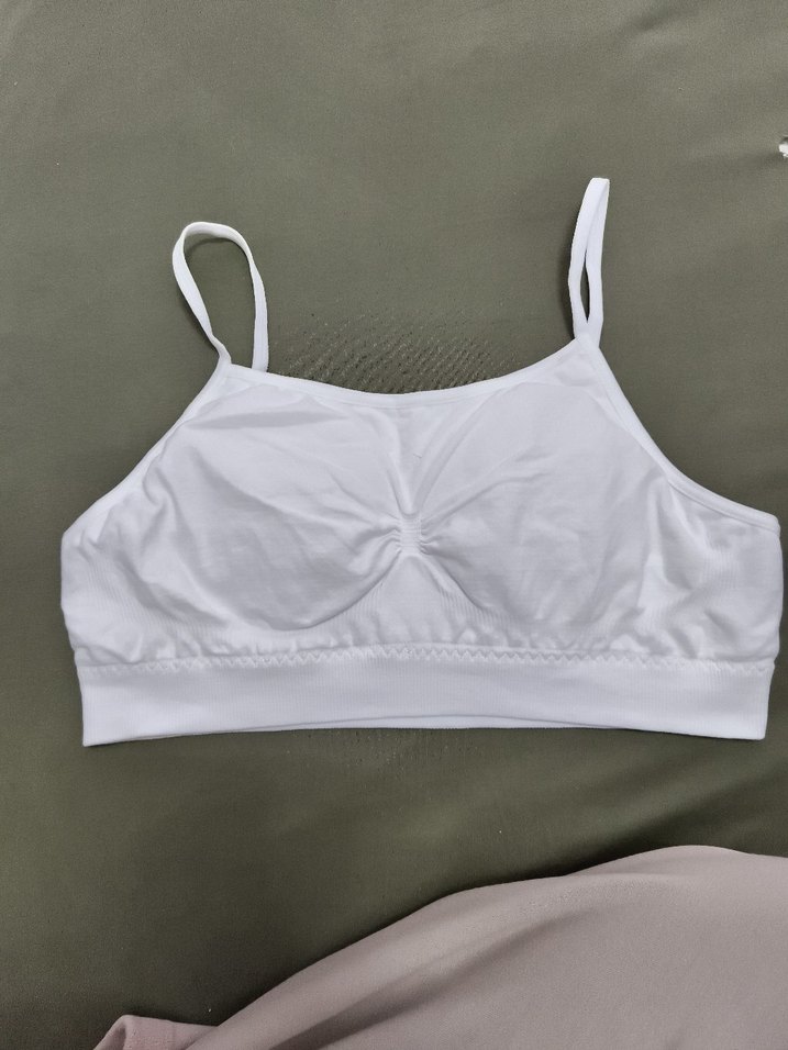 İnce askılı, beyaz spor sütyeni. Sokak modası ve athleisure tarzına uygun, desensiz ve rahat kesim. ♀️