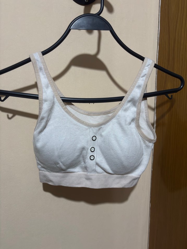 Beyaz spor sütyeni, midi boyda ve yumuşak pastel tonlarda. Önünde düğme detayları bulunan desensiz tasarıma sahiptir. Street wear tarzına uygun. ♀️