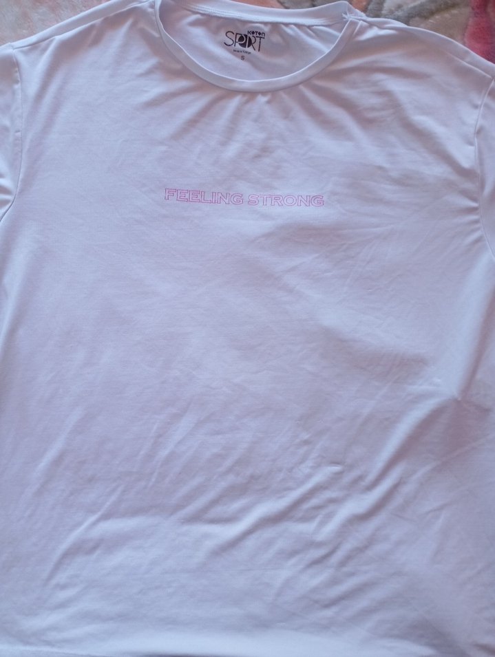 Beyaz pamuklu , kısa kollu ve yuvarlak yakalıdır. 'FEELING STRONG' baskılı, rahat kesim ve spor stil için uygundur.bir kez yogaya giderken giydim başka giymedim.yıkandı kaldırıldı.