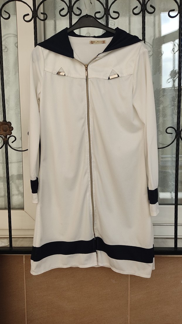 Beyaz sportif Fermuarlı kapşonlu Uzun Ceketi