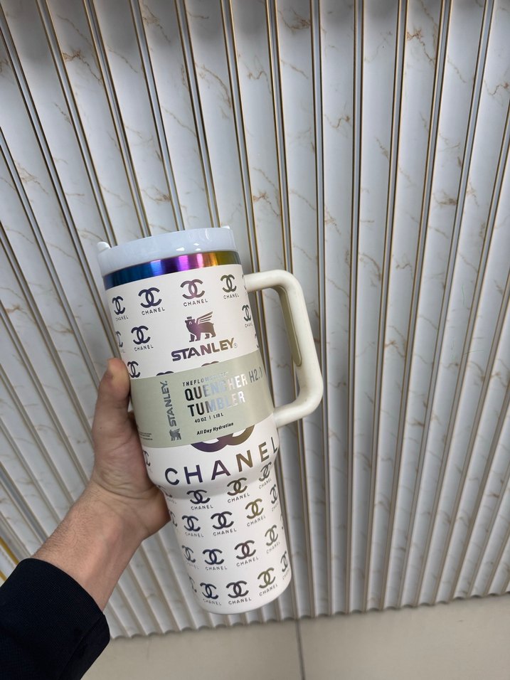 Chanel logosu desenli beyaz Stanley termos kupa, sağlam kulplu ve kapaklı, içecekleri sıcak veya soğuk tutar. ☕