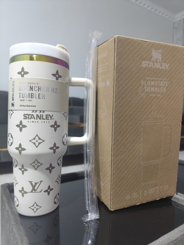 Saplı ve kapaklı beyaz Stanley Flowstate termos bardak, şık desenlidir. Hareket halindeyken kolayca su içmek için tasarlanmıştır. ☕