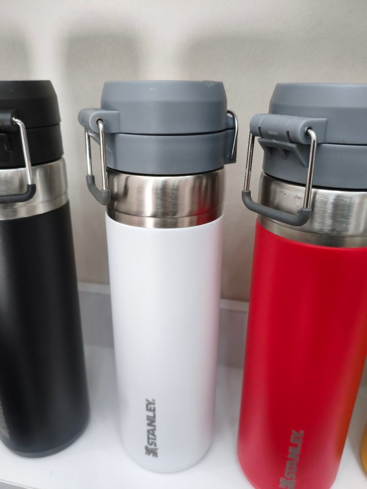 Çocuklar için renkli Stanley termos şişe, saplı güvenli kapak ve paslanmaz çelik gövdeye sahiptir, kırmızı, beyaz ve siyah renk seçenekleriyle.