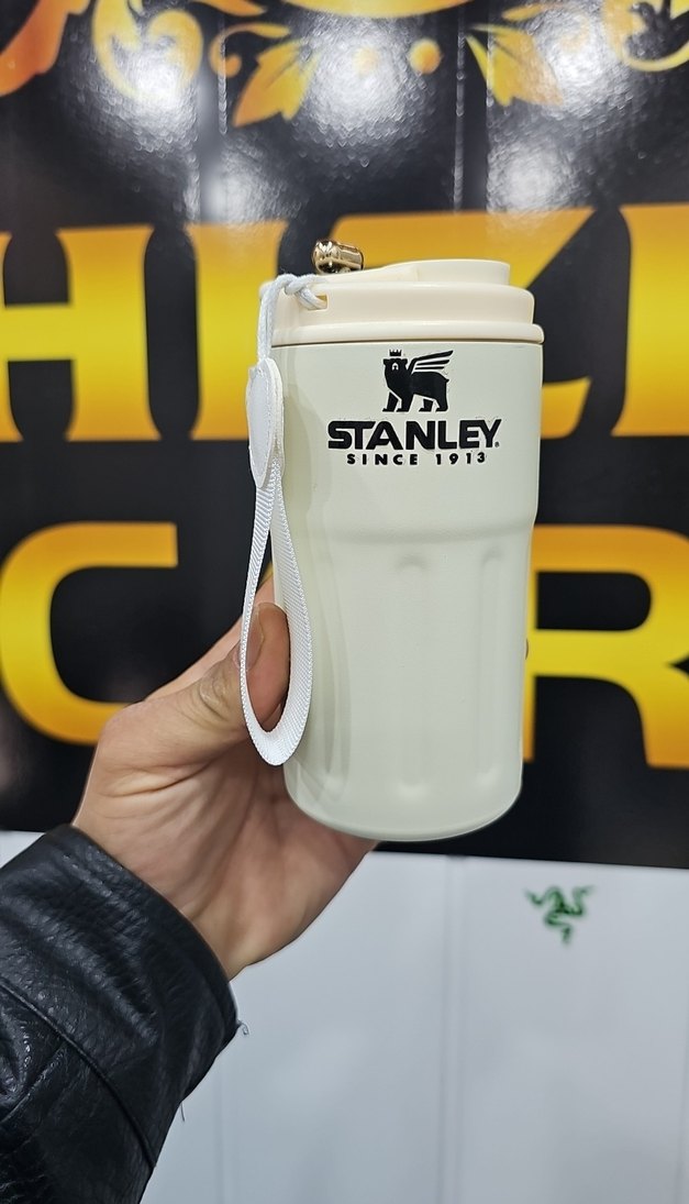Beyaz Stanley termos şişesi, güvenli kapak ve kolay taşıma için bilek askısına sahiptir. İçecekleri sıcak ya da soğuk tutar.
