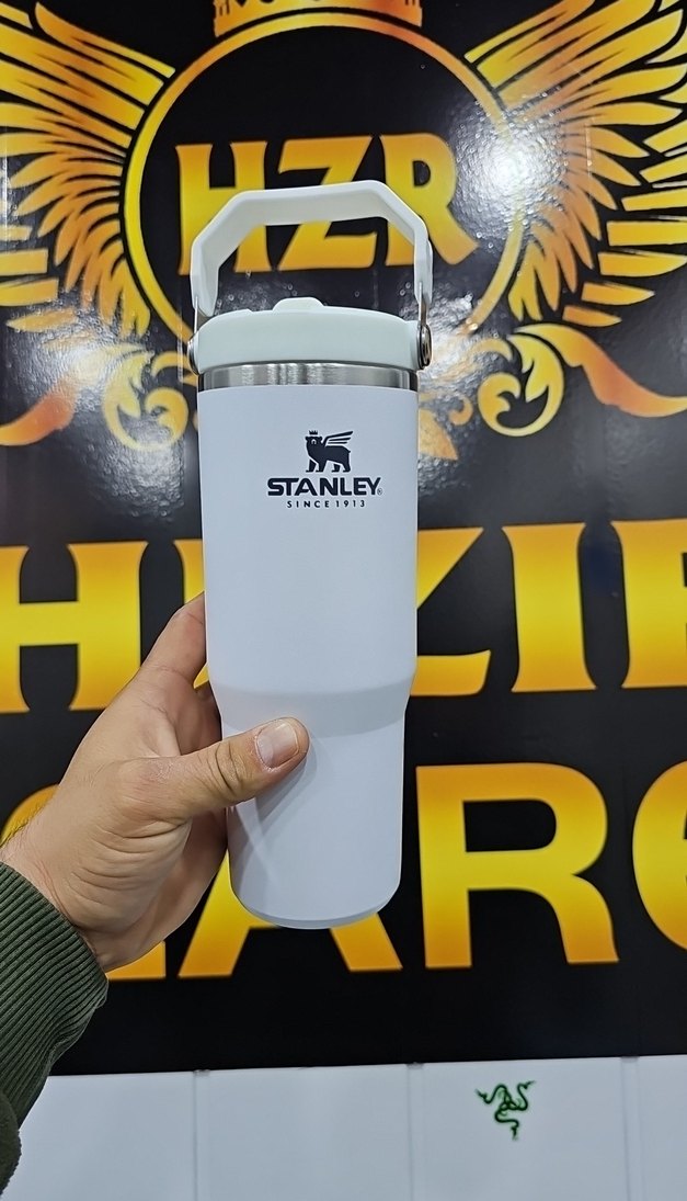 Beyaz renkli Stanley termos şişesi, dayanıklı sapı ve sağlam tasarımıyla içecekleri sıcak veya soğuk tutar. Stanley logosu bulunur.
