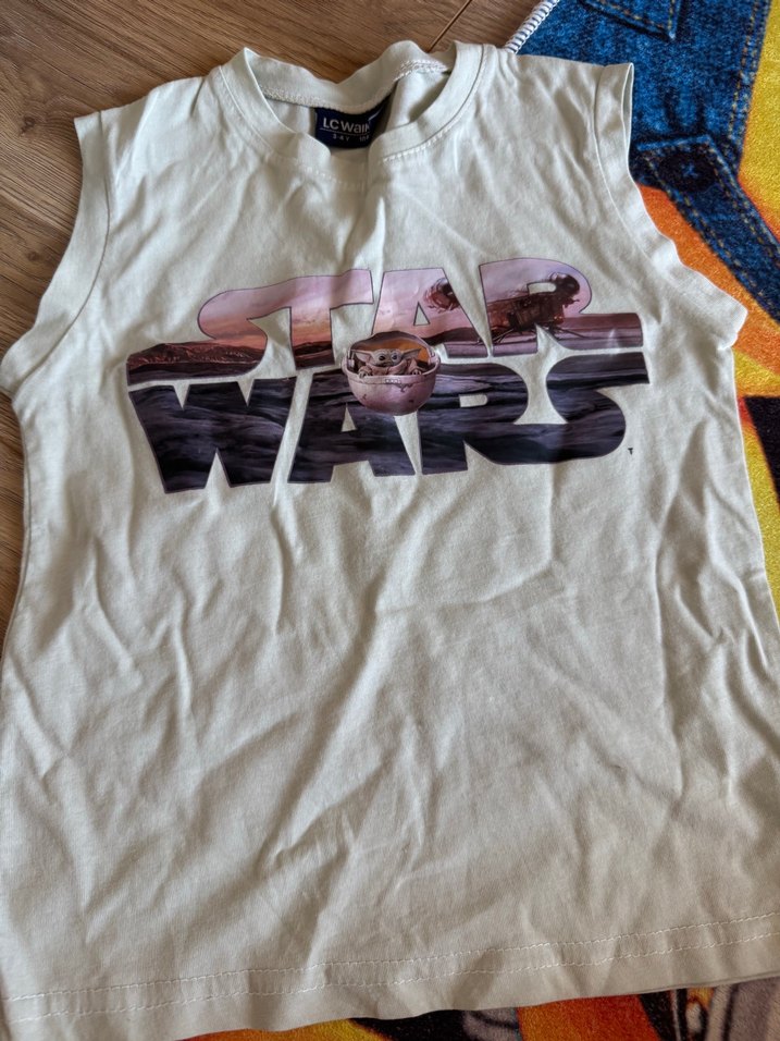 Yumuşak kumaştan, önünde Star Wars baskısı olan beyaz çocuk atleti.