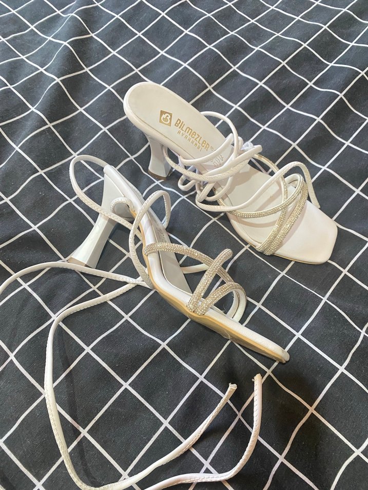 Beyaz renk, yılan desenli bantlar ve zincir detaylı stiletto topuklu kadın ayakkabısı. Düğünler için uygun, çağdaş tarzda ve kauçuk malzemeden yapılmıştır. Giyilmedi