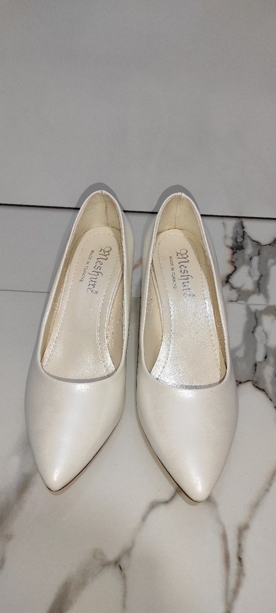 Beyaz renkte, modern klasik tarzda, düz tasarımlı ve kauçuk malzemeden yapılmış stiletto topuklu kadın ayakkabı. Düğün ve klasik şıklık için uygun. Marka: Meshut. bir kere tek giyilmistir