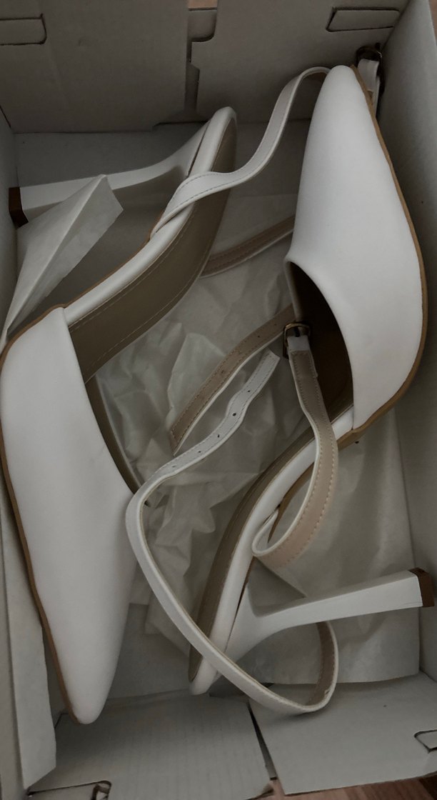 Beyaz stiletto topuklu, tokalı kayışlı, sentetik kumaştan kadın abiye ayakkabı. Çağdaş tasarım, düğün için uygun.