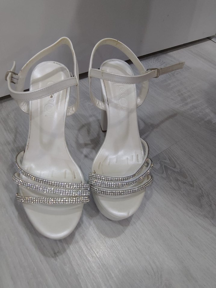 Beyaz stiletto topuklu, tokalı ve taş detaylı, kauçuk malzemeden yapılmış, düğün için uygun abiye ayakkabı. Bir kere düğünde giyildi