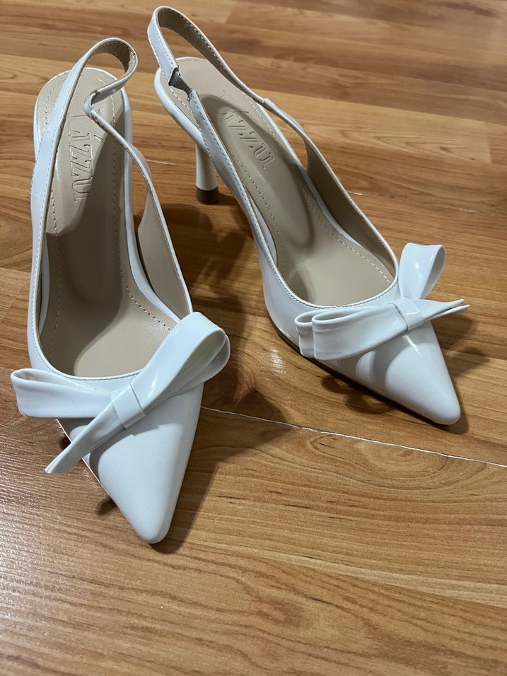 Yumuşak kauçuk malzemeden, sivri burunlu ve fiyonklu beyaz stiletto topuklu kadın ayakkabısı. Düğünler için uygundur.