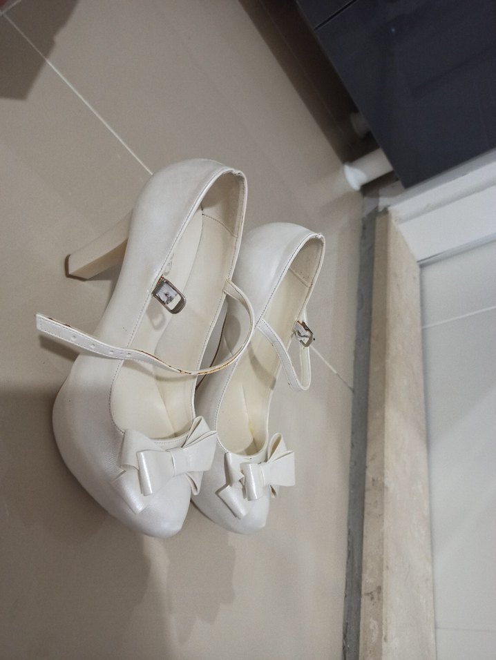Beyaz stiletto topuklu, tokalı ve fiyonk detaylı, kadın abiye ayakkabı. bir kere kullandim sıfır gibi hic bir sıkıntısı yoktur.