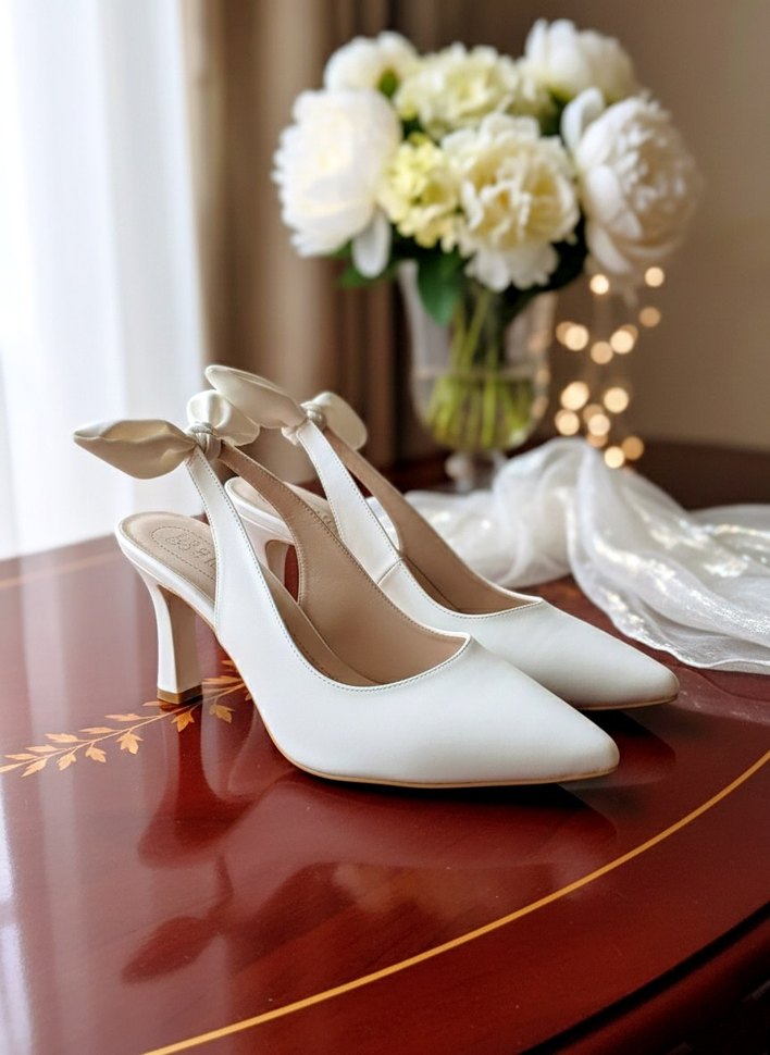 Beyaz stiletto topuklu abiye ayakkabı, arkada fiyonk detayı ile modern klasik tarzda, düğünler için uygun, pürüzsüz kauçuk malzemeden yapılmıştır.