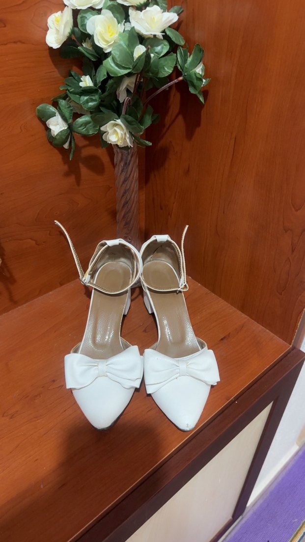 Beyaz stiletto topuklu, fiyonk detaylı, kauçuk malzemeden abiye ayakkabı. Minimalist ve modern klasik tarzda, düğün gibi özel günler için uygundur.