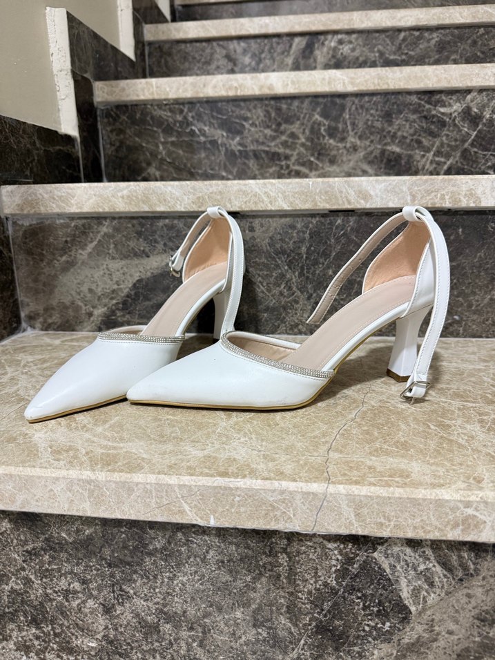 Beyaz stiletto topuklu, kemerli bilek kayışlı, desen içermeyen kauçuk malzemeden kadın abiye ayakkabısı. Düğünler için uygun. Sadece kendi nikahımda giydim bir kez giyildi