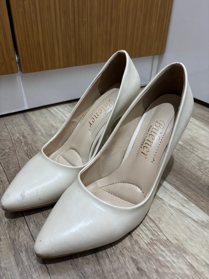 Beyaz stiletto topuklu, sivri burunlu ve düz yüzeyli kadın ayakkabı. Ürünü çok az kullandım. Defoları fotoğraflarda mevcut. Topuk uzunluğu 7 cm.