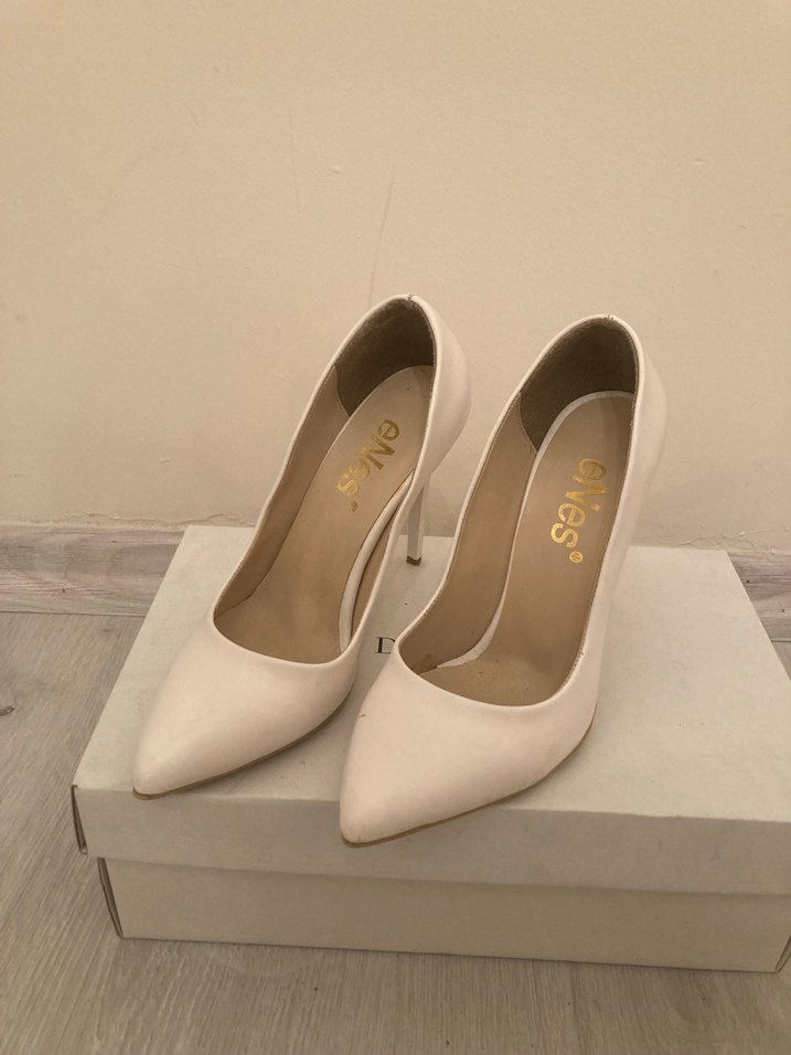 Beyaz stiletto topuklu, kauçuk tabanlı ayakkabı, minimalist ve modern klasik tarzda. Ofis için uygun, zahmetsiz şıklık ve klasik zarafet sunar.