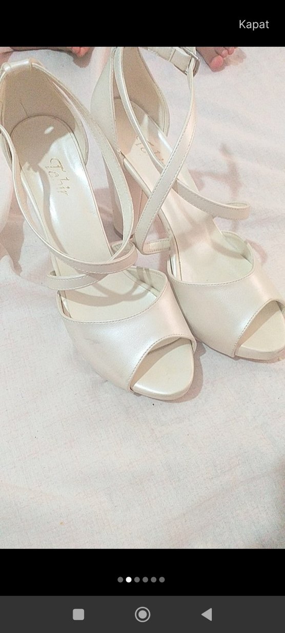 Beyaz stiletto topuklu, tokalı bantlı kadın gece ayakkabısı. Kauçuk malzemeden, minimalist ve çağdaş tasarım, düğün için uygun.