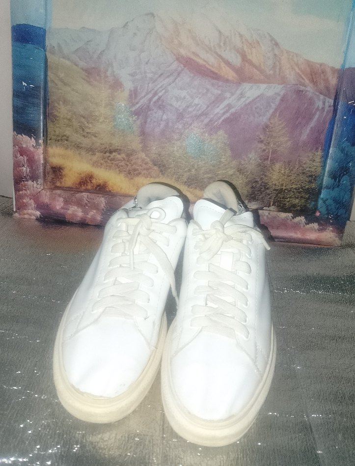 Beyaz renkte, stiletto topuklu ve lastik tabanlı kadın spor ayakkabısı, desen içermeyen sade tasarımıyla rahat ve şık bir görünüm sunar.